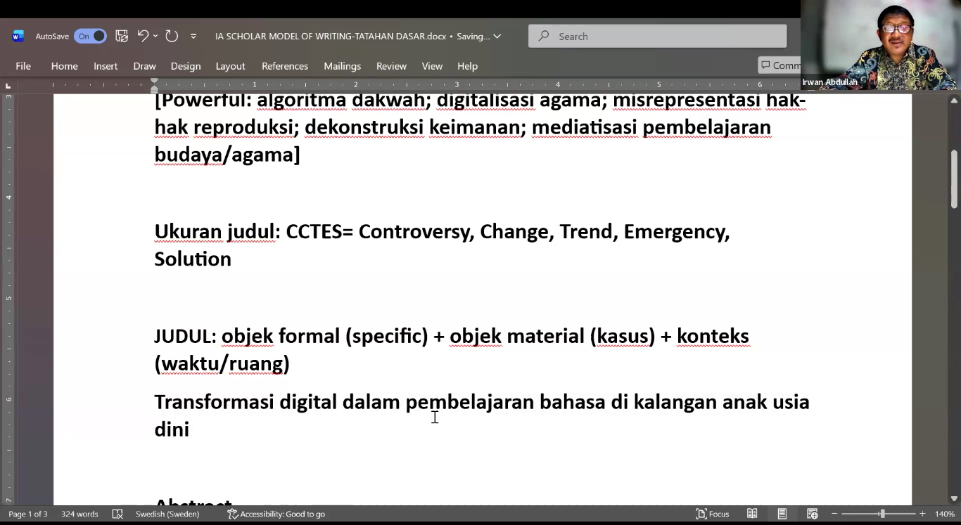 Setelah konsep SPIN terpenuhi, peserta diarahkan untuk mengembangkan tema tulisan menggunakan kerangka CCTES (Controversy, Change/Transformation, Trend, Emergency, dan Solution). Kerangka ini berfungsi untuk menajamkan posisi akademik tulisan agar tidak hanya deskriptif, tetapi juga kritis dan solutif. Prof. Irwan menegaskan bahwa konsep CCTES harus dirumuskan melalui perpaduan antara objek formal, objek material, dan konteks penelitian.
