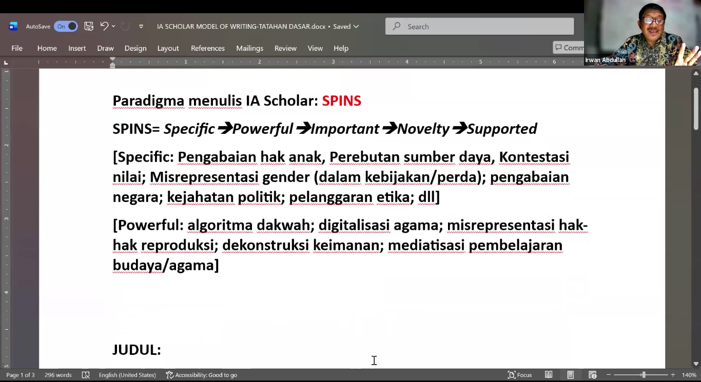 Dalam pemaparan selanjutnya, Prof. Irwan menjelaskan penerapan rumus SPIN sebagai fondasi awal dalam merumuskan ide tulisan, yang meliputi Specific, Powerful, Important, dan Novelty. Rumus SPIN digunakan untuk memastikan bahwa topik yang dipilih memiliki fokus yang jelas, kekuatan argumen, urgensi akademik, serta unsur kebaruan yang kuat dan relevan dengan diskursus global.